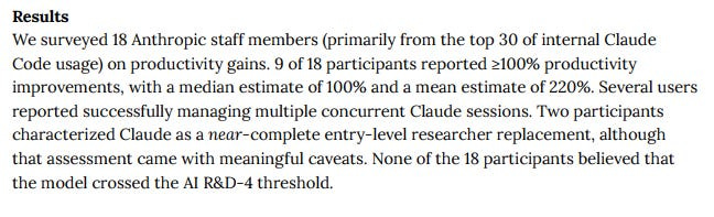 Not surprisingly, Anthropic views Claude Code in exactly the same way as OpenAI views Codex - i.e., as a coding tool that will eventually lead to automation of AI research. Indeed, Sonnet 4.5 and Opus 4.5 system cards conspicuously included results of surveys of Anthropic employees designed to evaluate whether the model, paired with Claude Code, is good enough to fully replace a junior AI researcher. In the Opus 4.5 survey, two (2) out of 18 participants classified Opus 4.5 as a “near-complete entry-level researcher replacement” - albeit with “meaningful caveats”.