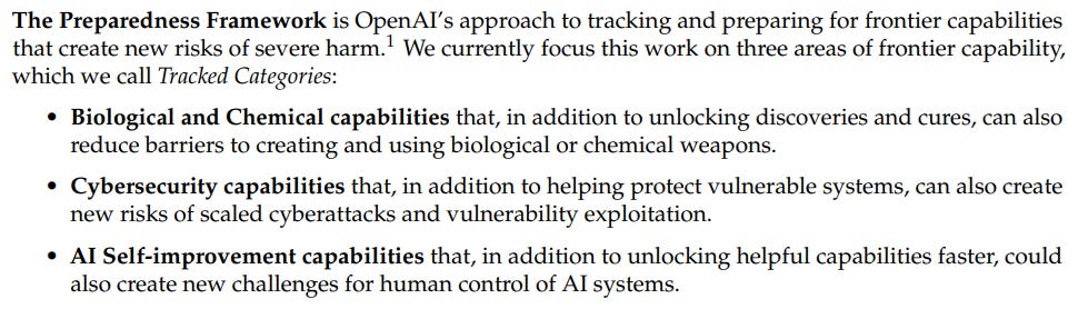 However, the fact that the Head of Preparedness will oversee safety efforts for model self-improvement should not be surprising. After all, the role’s primary responsibility is to “lead the technical strategy and execution of OpenAI’s Preparedness Framework”,1 which currently focuses on cybersecurity risk, bio risk, and - yes - model self-improvement.